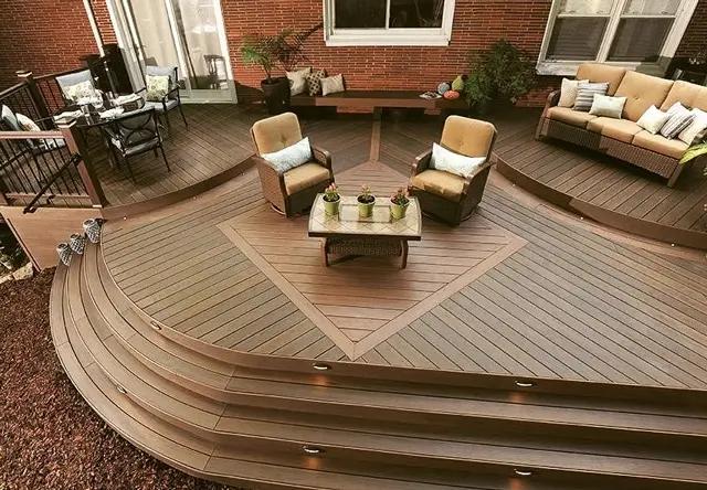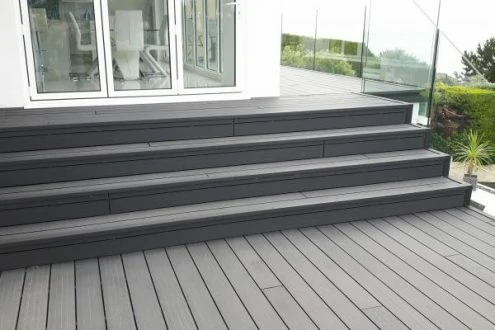 bullnose composite decking board completes the rough deck rim and neatly blends into the advanced look of the deck steps.